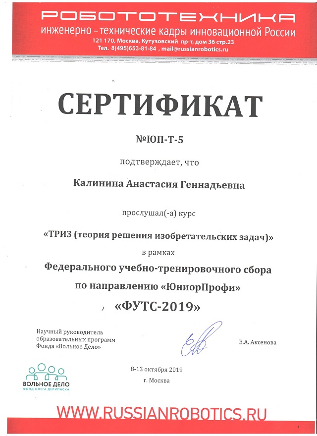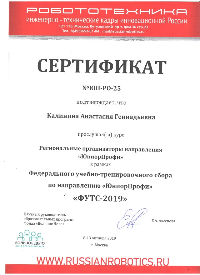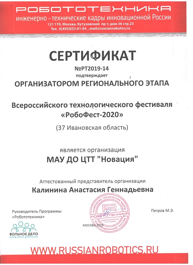 В Федеральном учебно-тренировочном центре г Москвы успешно прошли обучение и получили сертификаты педагоги Центра «Новация» - Калинина А.Г., Бурабаев М.М., Павлов К.С. Обучение по программам «Региональный организатор», «Региональный организаторы юниор- профи», «ТРИЗ» и «Региональное судейство» дает возможность Центру «Новация» организовать и провести Региональный этап Робофеста-Иваново 2020.